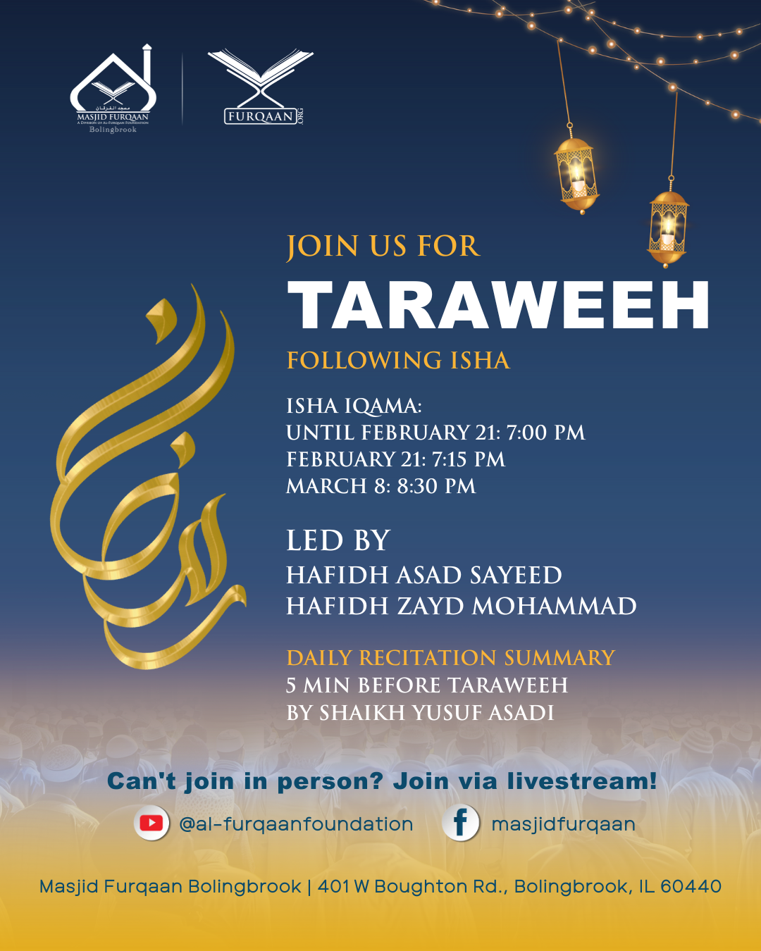 Ramadan Kareem! We are excited to have our community members join us in taking full advantage of this blessed month. Masjid Furqaan invites you to join us for group salat, taraweeh, itikaf, and many other chances at ibadah.