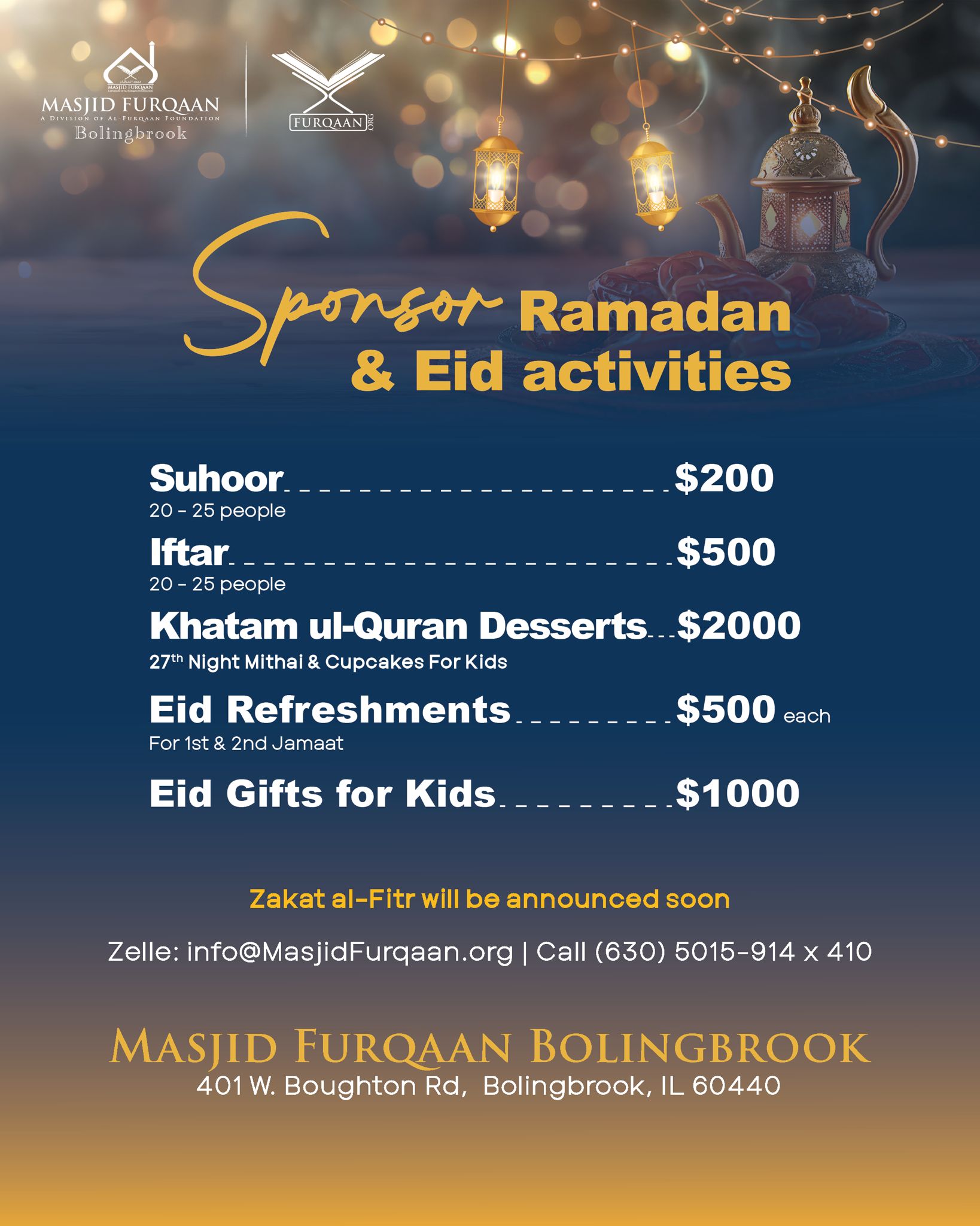Community Members are welcome to bring Iftar for all. Daily sign-up sheets are posted in the Masjid. Iftar may also be sponsored per the above details. Jazak Allah Khair!